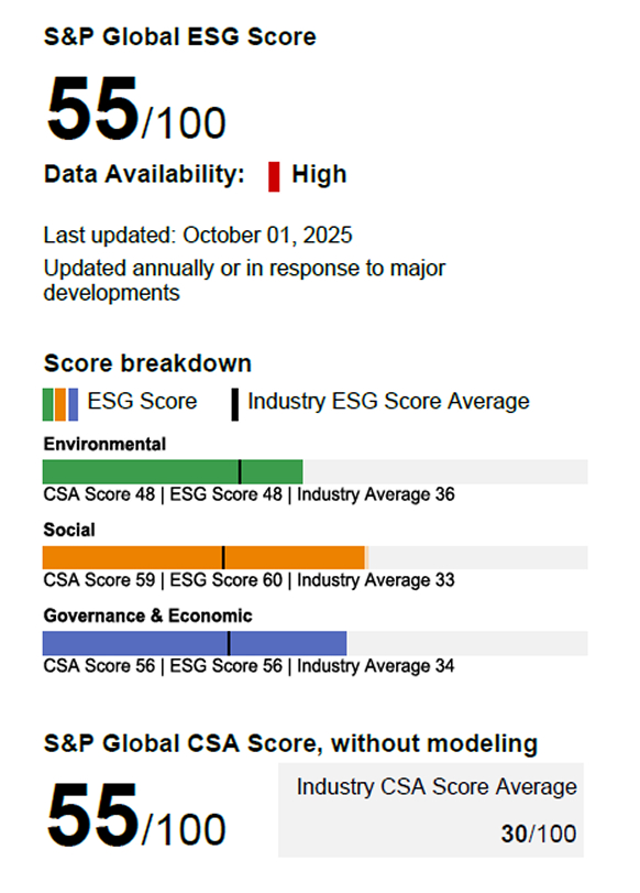 在标普全球(S&P Global)评级体系中,2025年度综合得分为55分